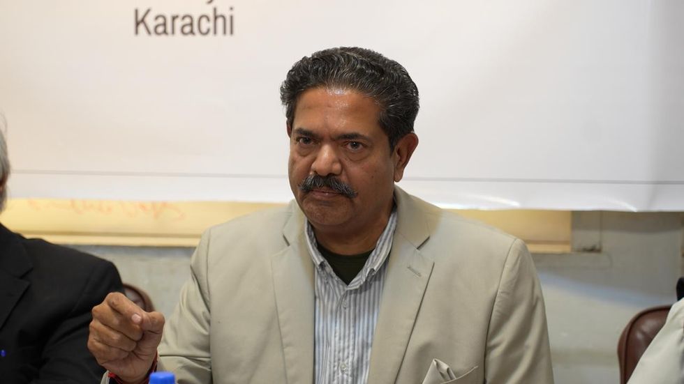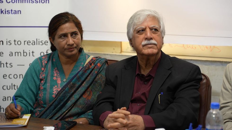 Minority rights activists and HRCP representatives including chairman Asad Iqbal Butt (CR) pictured at HRCP's report launch and press briefing on January 22, 2025.