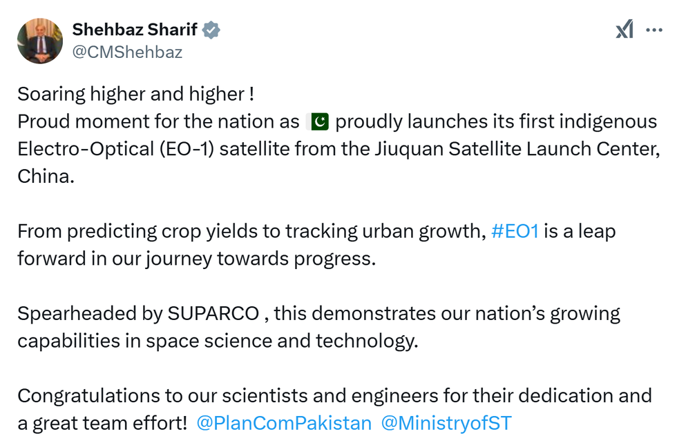 "Soaring higher and higher!" Pakistan's Prime Minister Shehbaz Sharif wrote on social media platform X, calling the launch "a proud moment" for the nation.