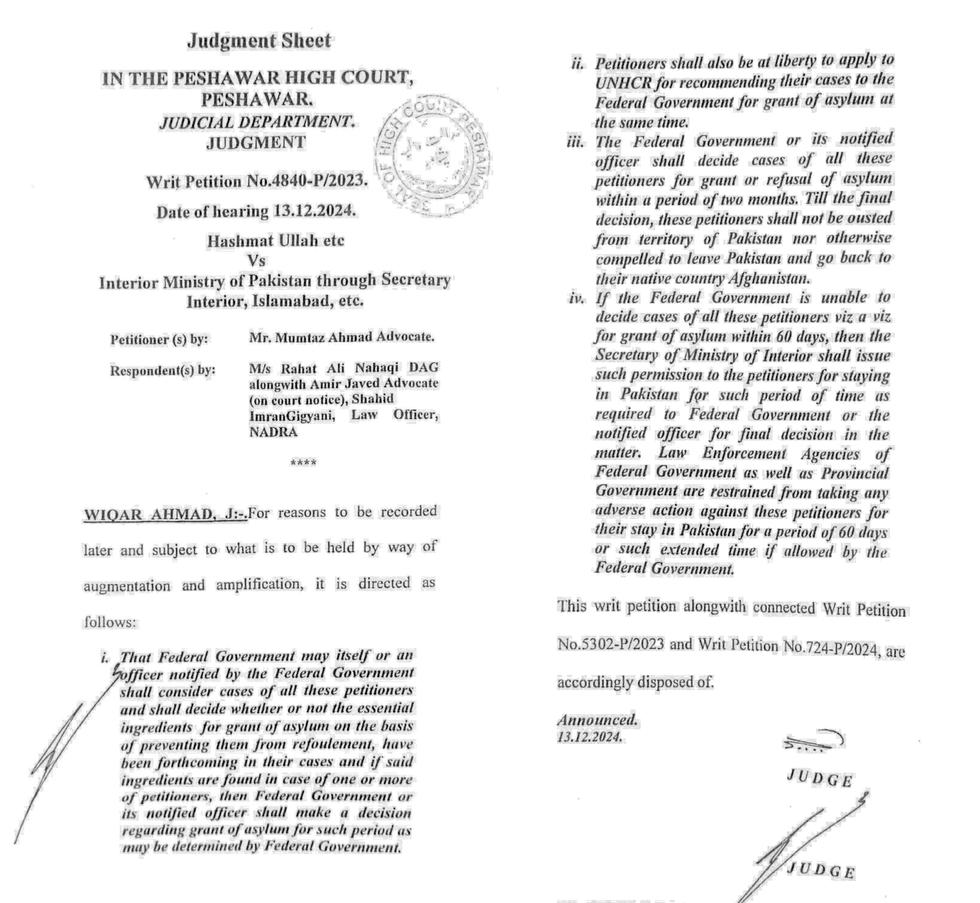 A two-member bench, comprising Justice Arshad Ali and Justice Wiqar Ahmed, issued the order after reserving their judgment following arguments concluded on December 13, 2024. The court directed authorities to process their asylum applications within 60 days.