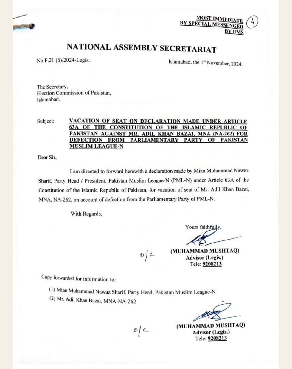 Several pieces of evidence challenged the authenticity of the PML-N affidavit, the court noted. During the National Assembly's first session on February 29, Bazai wore a badge with PTI founder Imran Khan's photograph while taking his oath and signing the roll of members. The National Assembly's Bulletin No. 1 (2024) listed Bazai as an independent member at serial No. 254, and official Assembly records through September 27 continued to show him as independent.