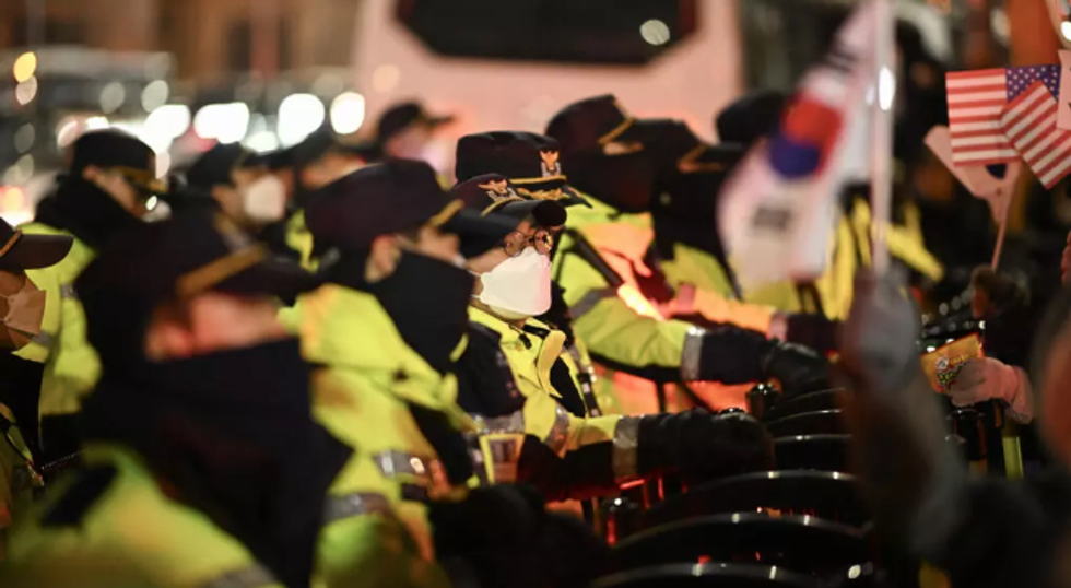 Police stood guard in front of a rally to support Yoon outside his residence.