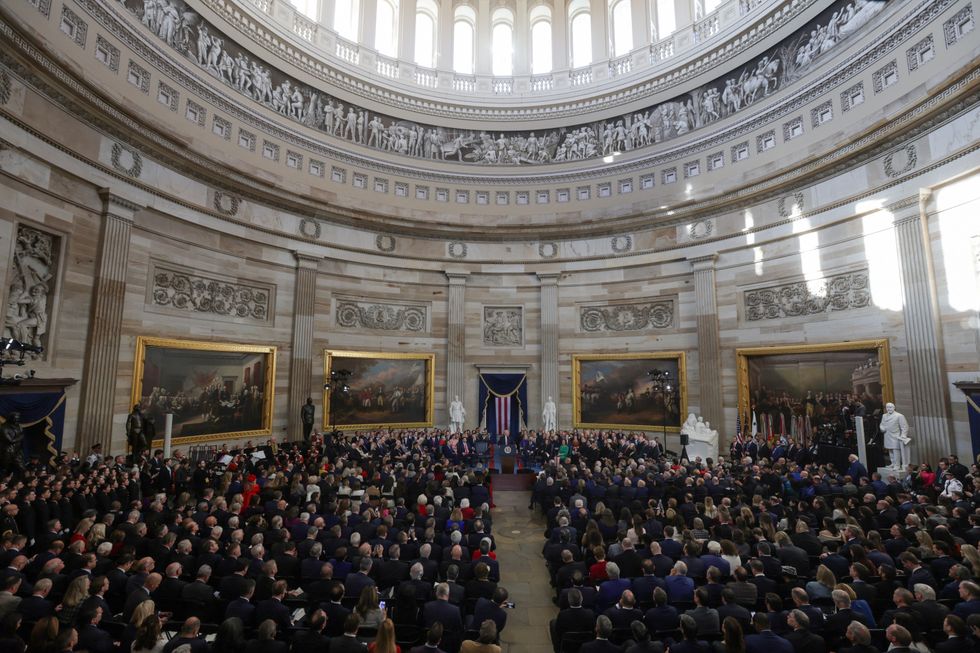 U.S. Vice President J.D. Vance applauds as U.S. President Donald Trump gestures on the day of his Presidential Inauguration at the Rotunda of the U.S. Capitol in Washington, U.S., January 20, 2025.