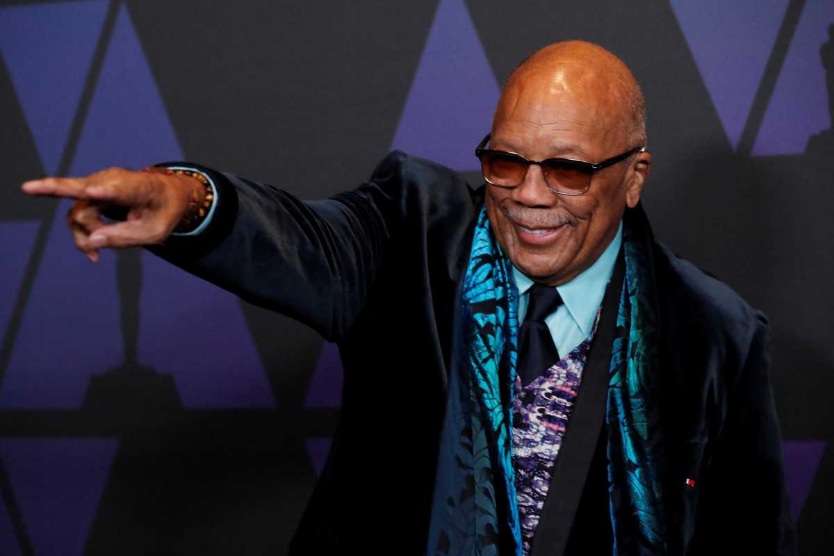FILE PHOTO: Composer Quincy Jones shows his hands after placing them in cement during a ceremony in the forecourt of the TCL Chinese Theatre in Los Angeles, California, U.S., November 27, 2018.