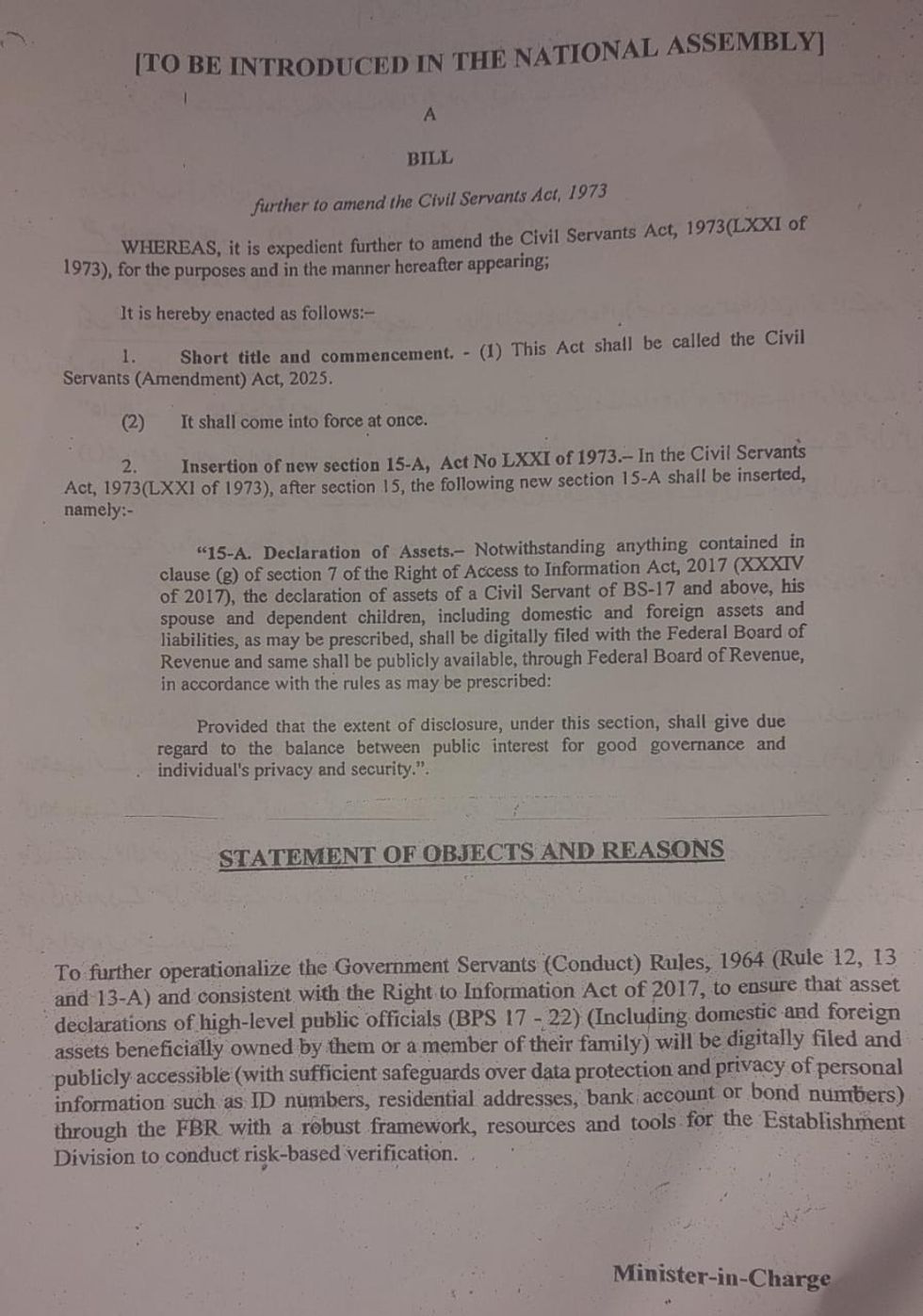 The bill, referred to committee, would amend the Government Servants (Conduct) Rules, 1964 (Rules 12, 13 and 13-A) to align with the Right to Information Act of 2017. The legislation requires digital filing of asset declarations for officials in grades 17-22, including domestic and foreign assets owned by them or family members.