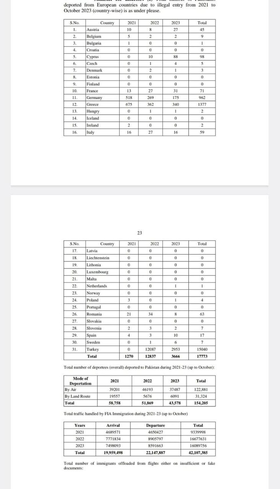 According to figures from the Ministry of Interior, between 2021 and 2023, about 154,205 Pakistani nationals were deported from various countries due to illegal entry, averaging 4,280 deportations per month. Additionally, over the past three years, 44,000 individuals were offloaded.