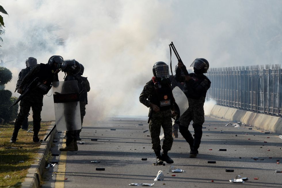Security forces have pushed protesters nearly a kilometer back from high-security district D-Chowk, using tear gas and rubber bullets. Protesters retaliated with stones and by throwing back tear gas canisters.