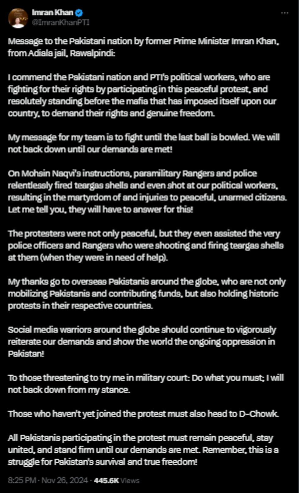 Khan issued a statement from his Adiala Jail cell that was posted on social media, saying "those who haven't yet joined the protest must also head to D-Chowk", referring to the public square marchers are attempting to occupy.