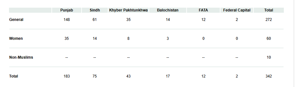 The National Assembly currently has 342 seats, with Punjab holding a total of 183 seats - 48 general and 35 reserved for women.