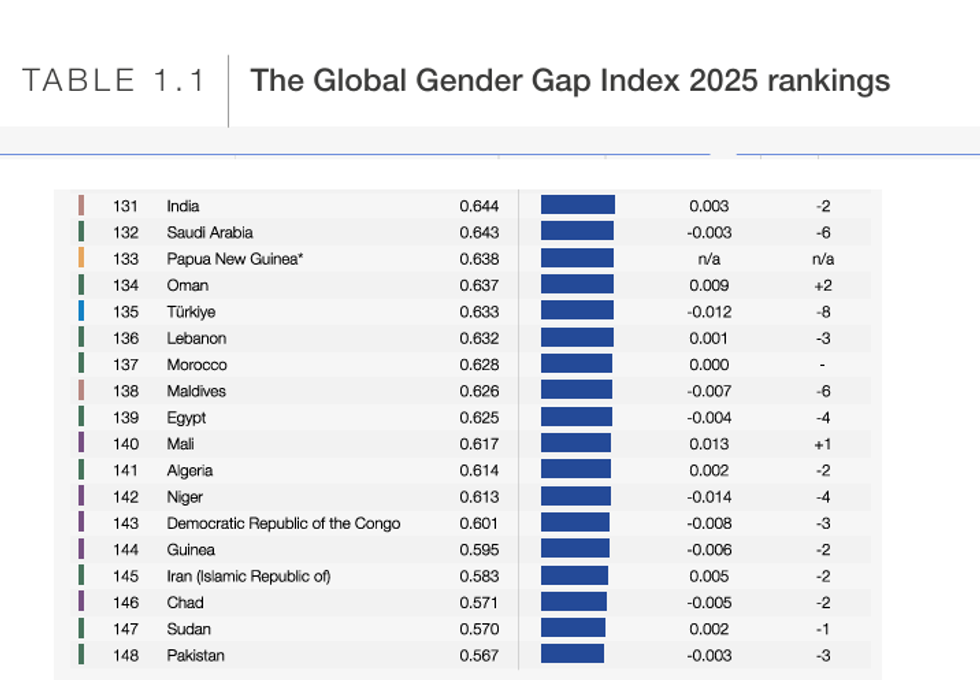 Pakistan has been ranked at the very bottom -- 148th out of 148 countries -- in the World Economic Forum’s (WEF) Global Gender Gap Report 2025, highlighting entrenched and worsening gender disparities, especially in political and economic participation.