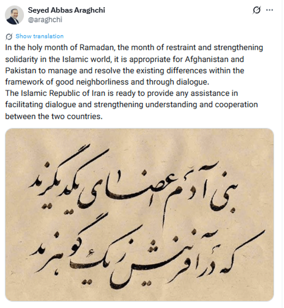 Iranian Foreign Minister Abbas Araghchi said on X on Friday that, during the holy month of Ramadan, “it is appropriate for Afghanistan and Pakistan to address and resolve their differences through dialogue and within the framework of good neighborliness.”