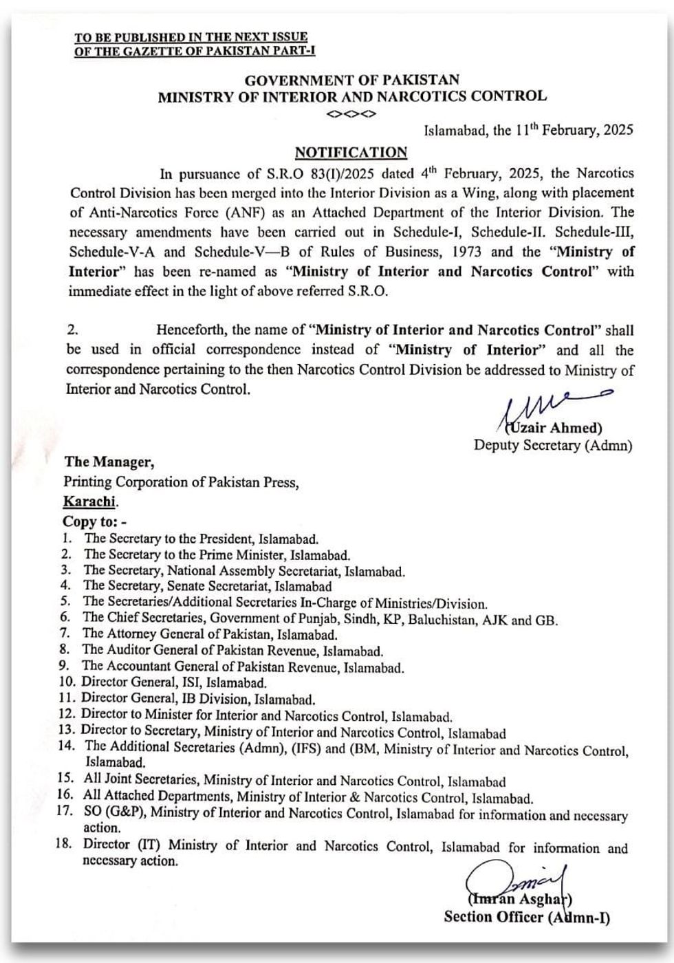"All correspondence related to narcotics control will now be addressed to the Ministry of Interior and Narcotics Control," said Uzair Ahmed, Deputy Secretary, in the official notification.