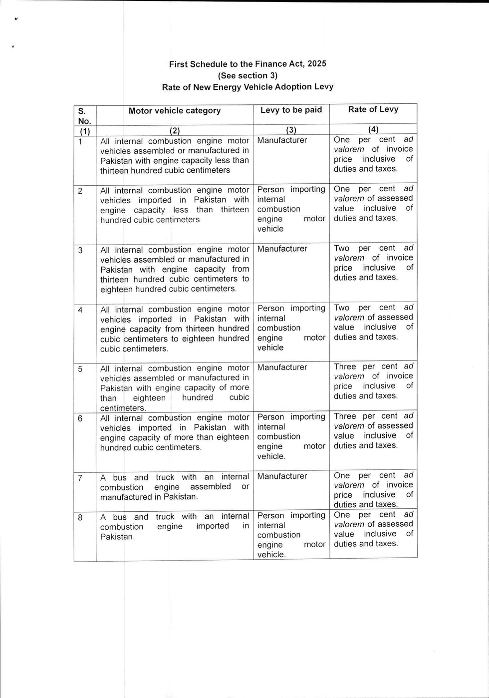 FBR rolls out New Energy Vehicles Adoption Levy under Finance Act 2025, targeting ICE vehicle makers and importers