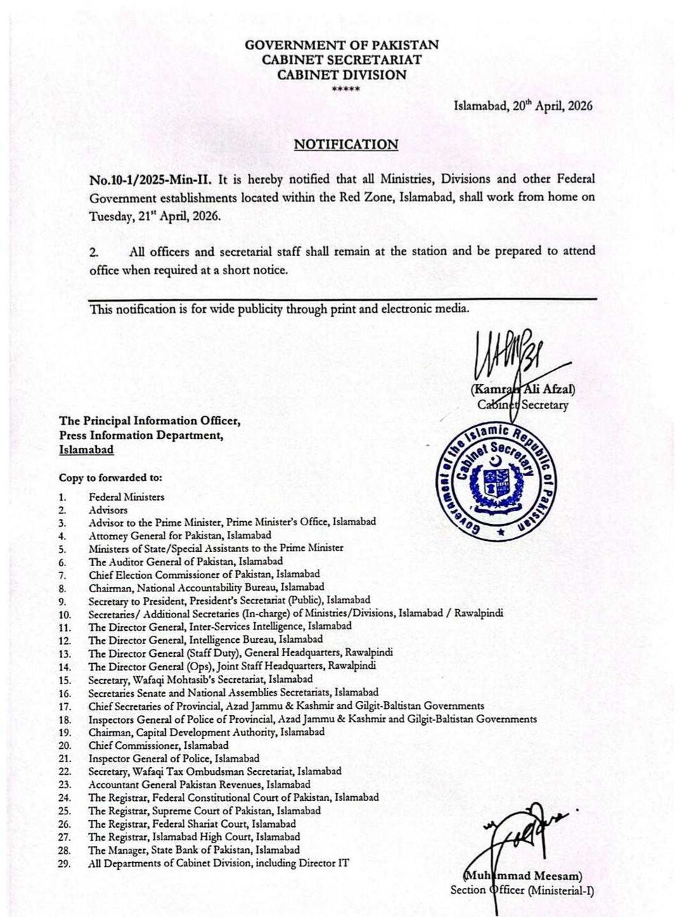 Officials said the order was issued for wide public awareness through print and electronic media. Copies of the notification were circulated to federal ministers, provincial chief secretaries, the Election Commission, judiciary offices and other key national institutions.