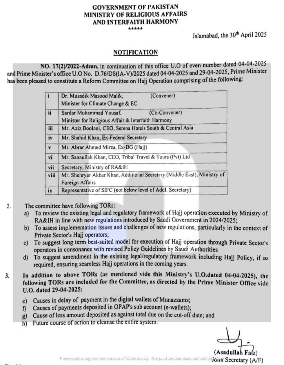 The body includes Musadik Malik as convener and Federal Minister for Religious Affairs Sardar Muhammad Yousuf as co-convener. Other members are Aziz Boolani, former Federal Secretary Shahid Khan, former DG Hajj Abrar Ahmed Mirza, CEO Tribal and Tour Sanaullah Khan, Secretary for Religious Affairs Shahryar Akbar Khan, Additional Secretary Middle East at the Ministry of Foreign Affairs, and Additional Secretary of the Special Investment Council.