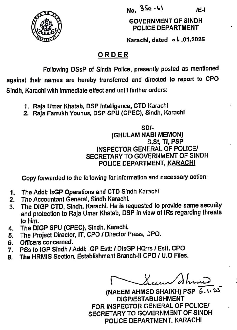 Meanwhile, DSP CTD Intelligence Raja Umar Khattab was transferred and asked to report to the Central Police Office (CPO).
