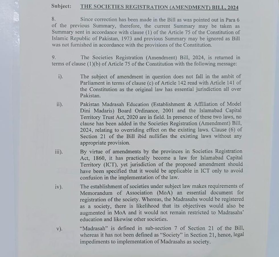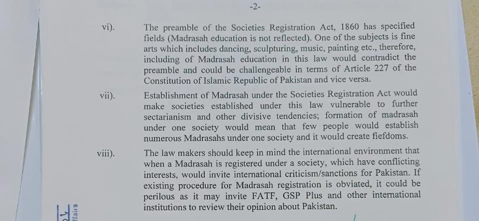 The eight-point document outlining objections to not signing off on the bill, obtained by Nukta, highlights concerns that the bill could invite scrutiny from global financial watchdogs and contradict existing Pakistani laws governing religious schools.