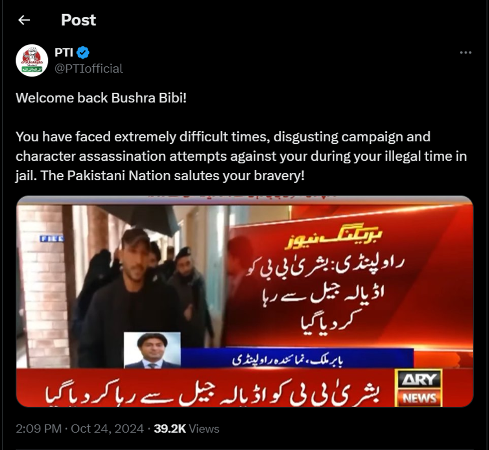 "Welcome back Bushra Bibi! You have faced extremely difficult times, disgusting campaign and character assassination attempts against your during your illegal time in jail," Khan's party, the Pakistan Tehreek-e-Insaf, said in a post on X.