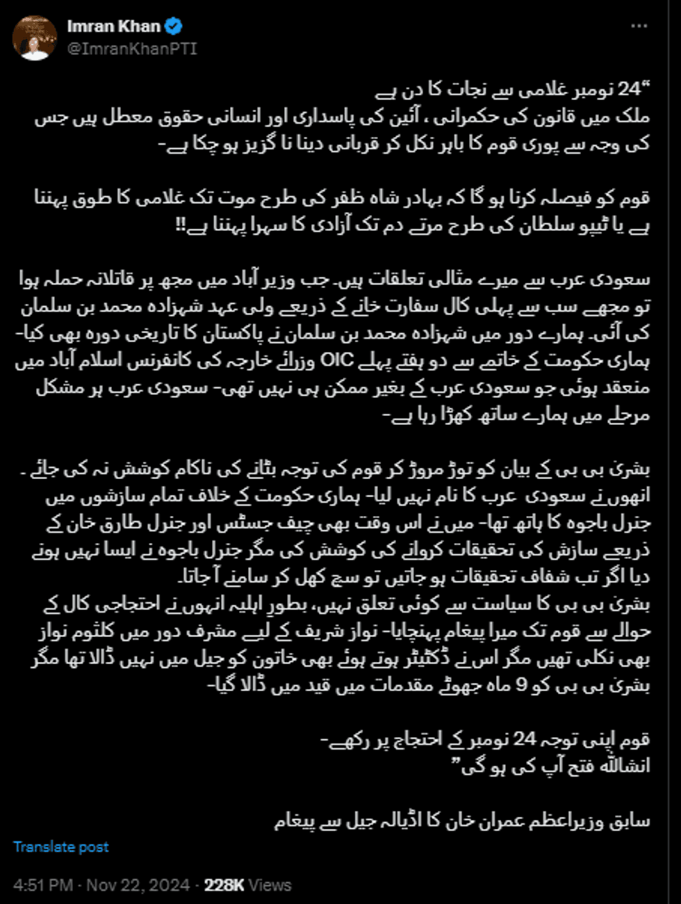 The PTI chief also highlighted his “exemplary” relationship with Saudi Arabia. “Crown Prince Mohammed bin Salman was the first to call after the Wazirabad attack [in which Khan’s sustained bullets wounds in 2022]. Saudi Arabia has always supported Pakistan unconditionally,” Khan added, pointing to the Kingdom’s role in hosting a key OIC summit during his term.