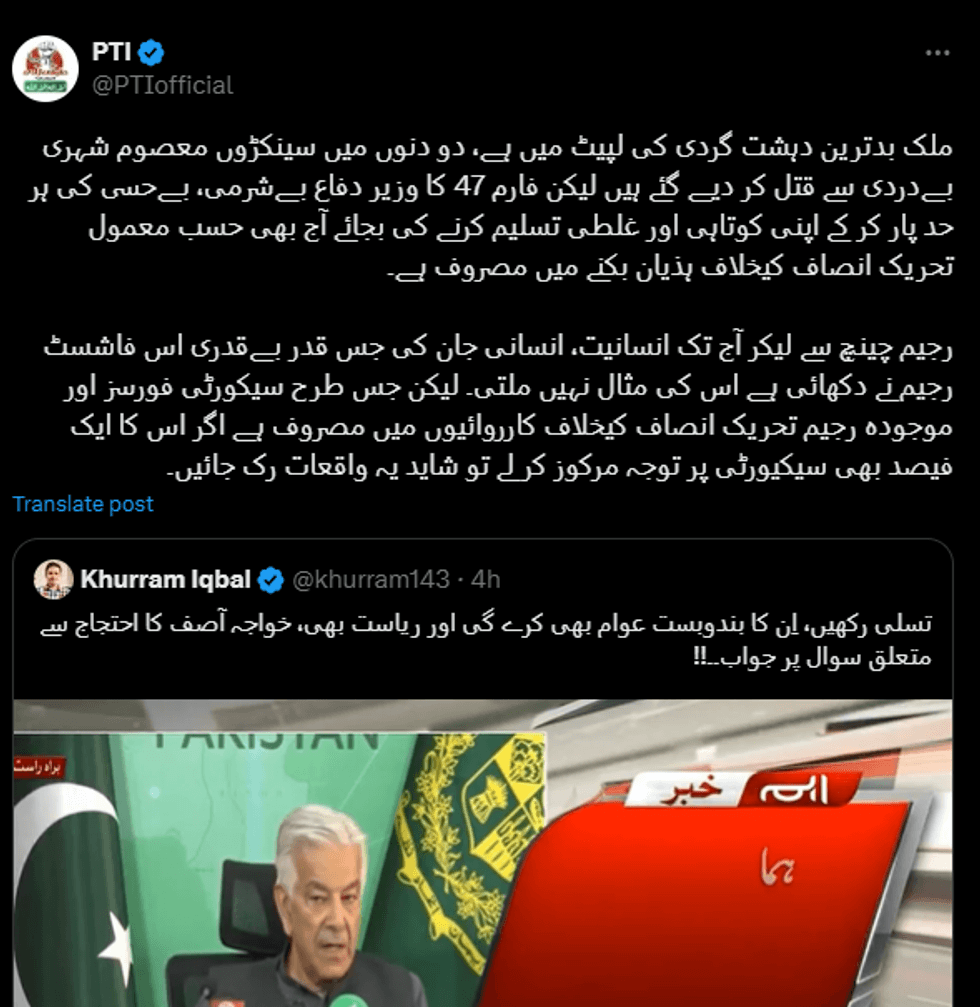 PTI hit back, accusing the government of neglecting national security amid rising terrorism. “Instead of addressing shortcomings, the defense minister is fixated on raving against PTI,” the party said on X.