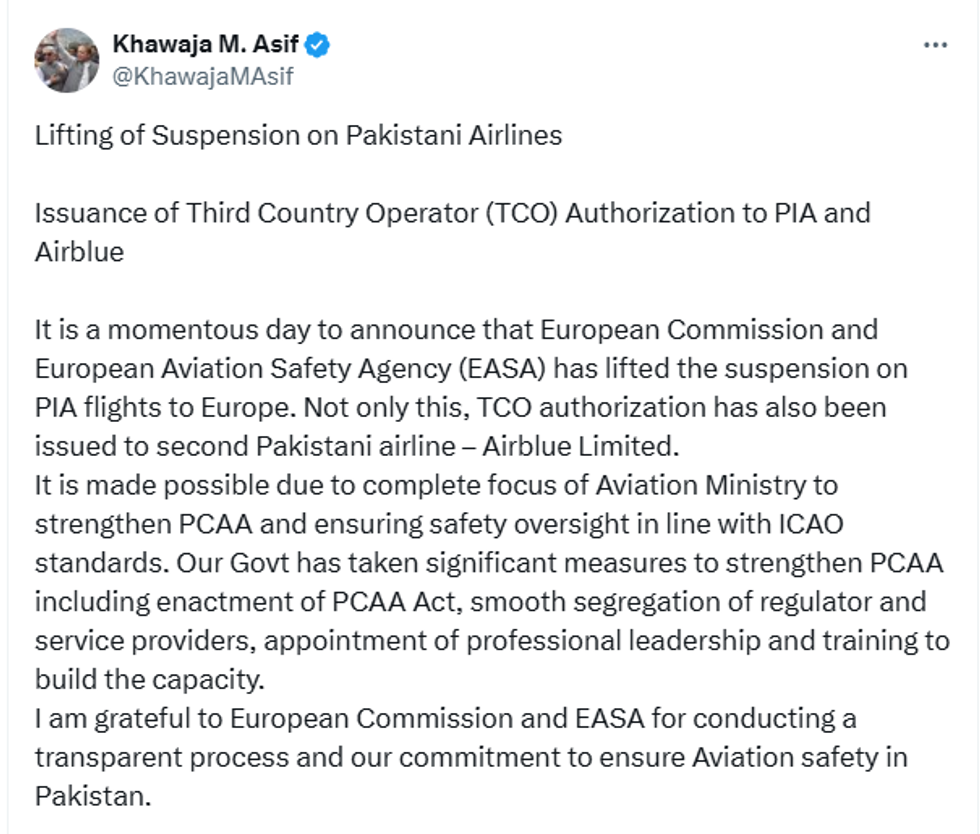 Pakistan's Minister for Aviation and Defence, Khawaja Asif, announced on Friday that the European Commission and the European Aviation Safety Agency (EASA) have lifted the suspension on the country's national carrier, Pakistan International Airlines (PIA), flights to Europe.