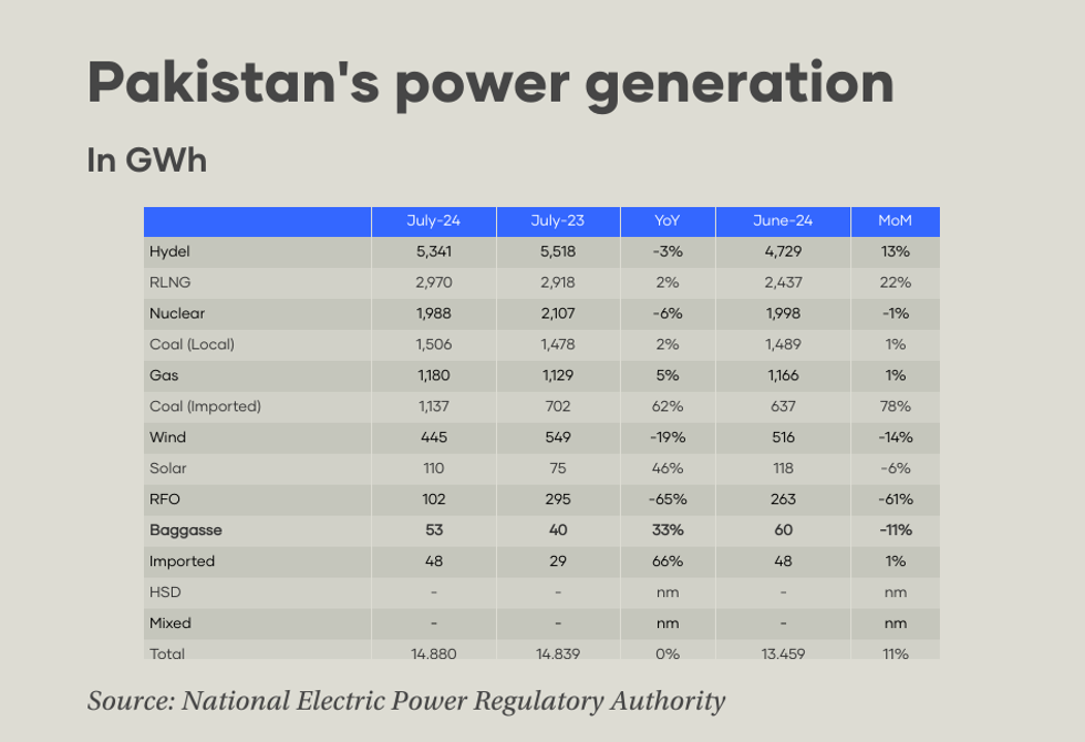 Meanwhile, hydel-based generation accounted for 36% of the total in July, producing 5,341 GWh compared to 5,518 GWh in July 2023. RLNG-based generation was the second-largest source, producing 2,970 GWh, which is 2% higher than in July 2023 and 22% higher than June.