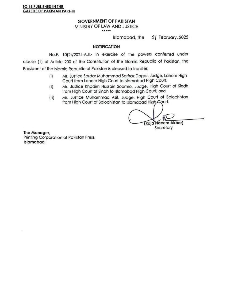 According to the notification, Justice Sardar Muhammad Sarfraz Dogar has been transferred from the Lahore High Court to the Islamabad High Court, while Justice Khadim Hussain Soomro from the Sindh High Court and Justice Muhammad Asif from the Balochistan High Court have also been reassigned to the IHC.