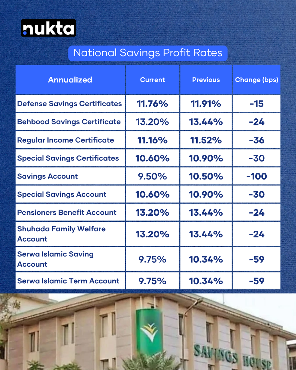 Regular Income Certificates dropped 36bps, now offering 11.16%. Special Savings Certificates declined by 30bps, settling at 10.6%.