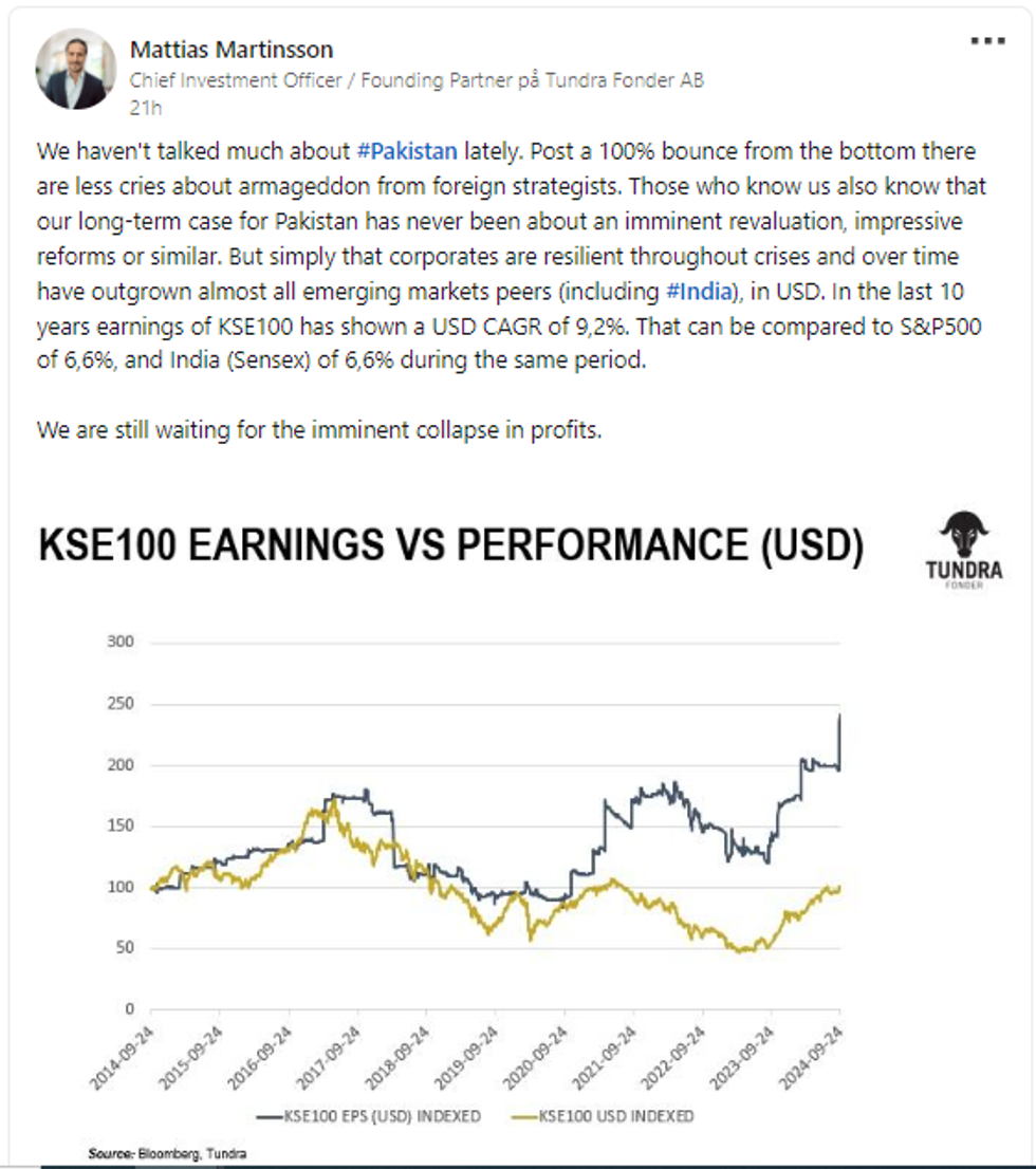 Mattias Martinsson, founder of the foreign investment company Tundra Fonder, highlighted this achievement in a recent LinkedIn post. Martinsson, whose company has millions of dollars invested in Pakistan, pointed out that following a 100% rebound from market lows, there is now less pessimism from foreign strategists.