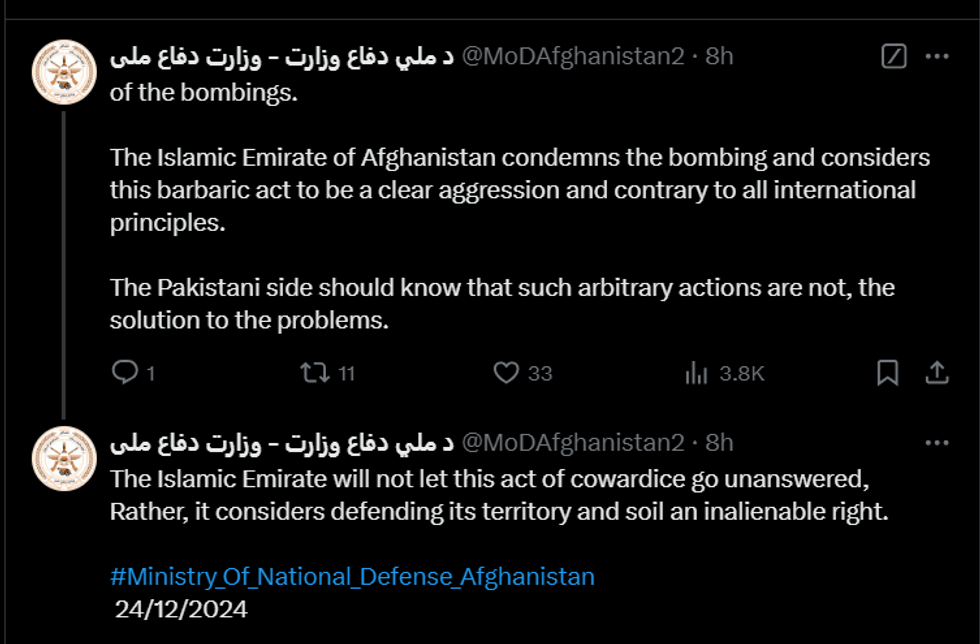"The Islamic Emirate will not let this act of cowardice go unanswered, Rather, it considers defending its territory and soil an inalienable right," the ministry stated in a post on X.
