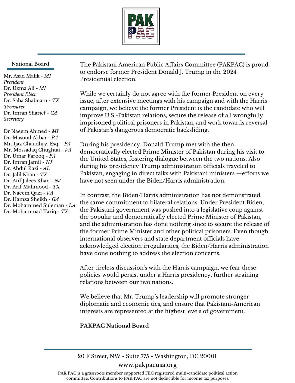 PAKPAC praises Trump for past Pakistan ties, criticizes Biden-Harris for ignoring Imran Khan's ‘political’ detainment