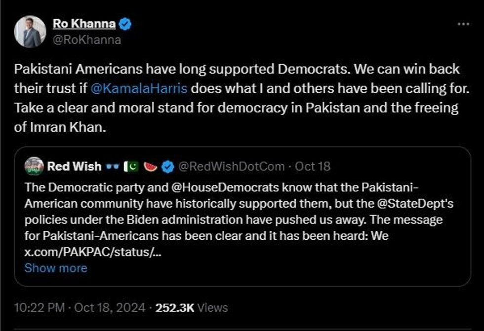 Khanna, who has strong support among South Asian Americans, stated that Democrats could win over Pakistani American voters if Kamala Harris were to take a "clear and moral stand for democracy in Pakistan and freeing Imran Khan. His tweets were later shared by PAKPAC through their official X account.