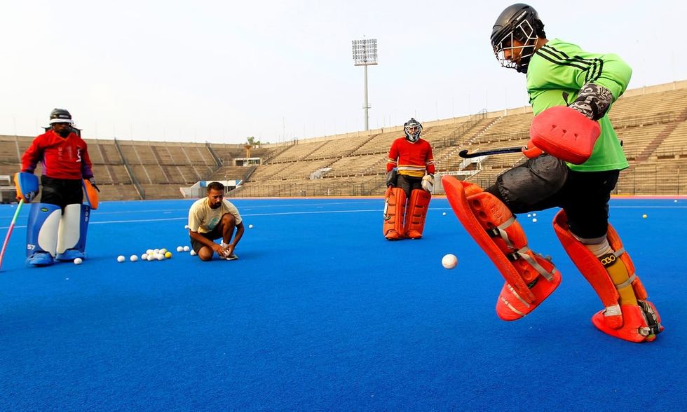 Hockey players train at the Gaddafi field hockey stadium in Lahore.