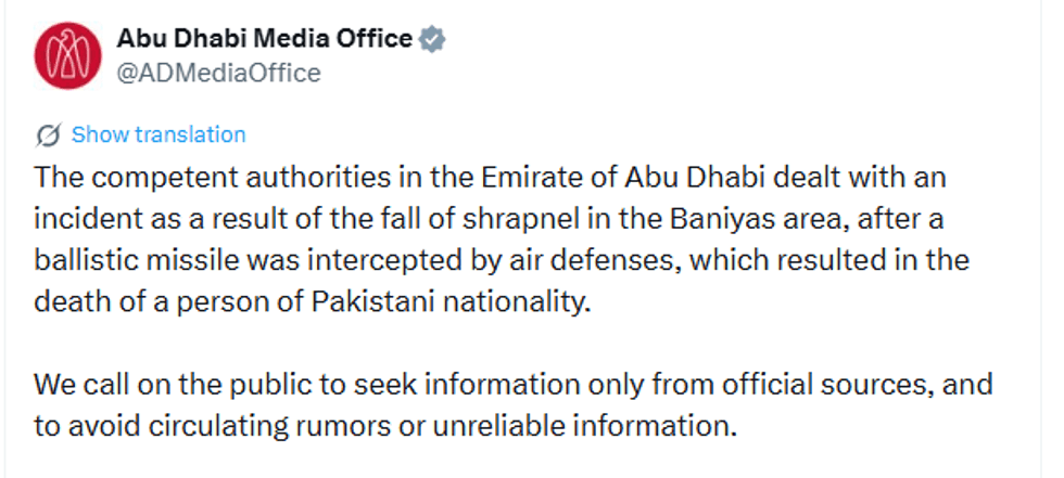 The incident occurred in the Baniyas area "following the interception of a ballistic missile by air defenses," the Abu Dhabi Media Office added. Authorities urged the public to rely only on official sources and avoid circulating rumors or unverified reports.