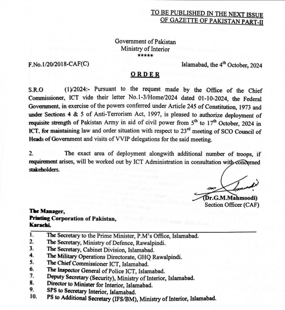 The deployment is part of security measures for the Shanghai Cooperation Organization (SCO) summit and has been authorized under Article 245 of the Constitution.