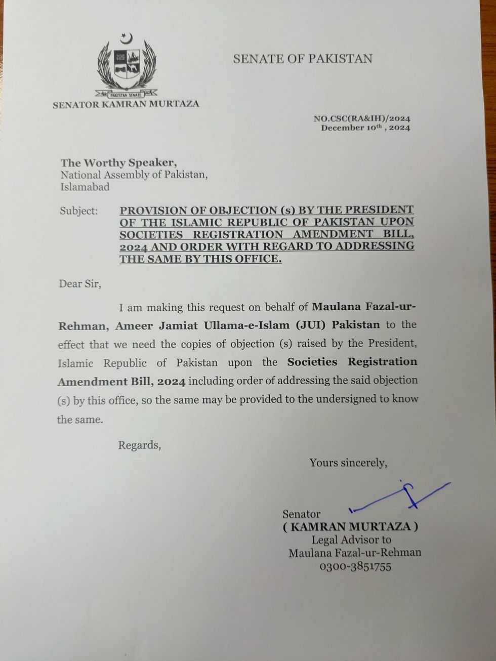 A letter penned by Senator Kamran Murtaza, on behalf of JUI-F chief Maulana Fazlur Rehman, urged Sadiq to disclose the specific objections and clarify actions taken to resolve them.