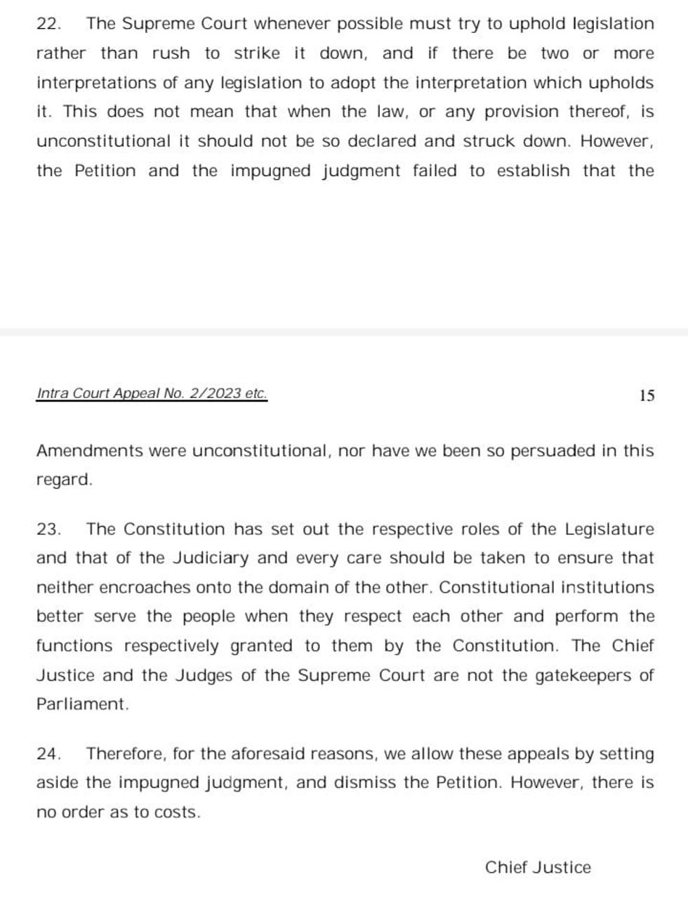 In the 16-page judgment, the apex court has said that it cannot serve as a gatekeeper for parliament, emphasizing that neither the chief justice nor judges can assume this role. The ruling further noted that the court should preserve legislation in every possible manner.