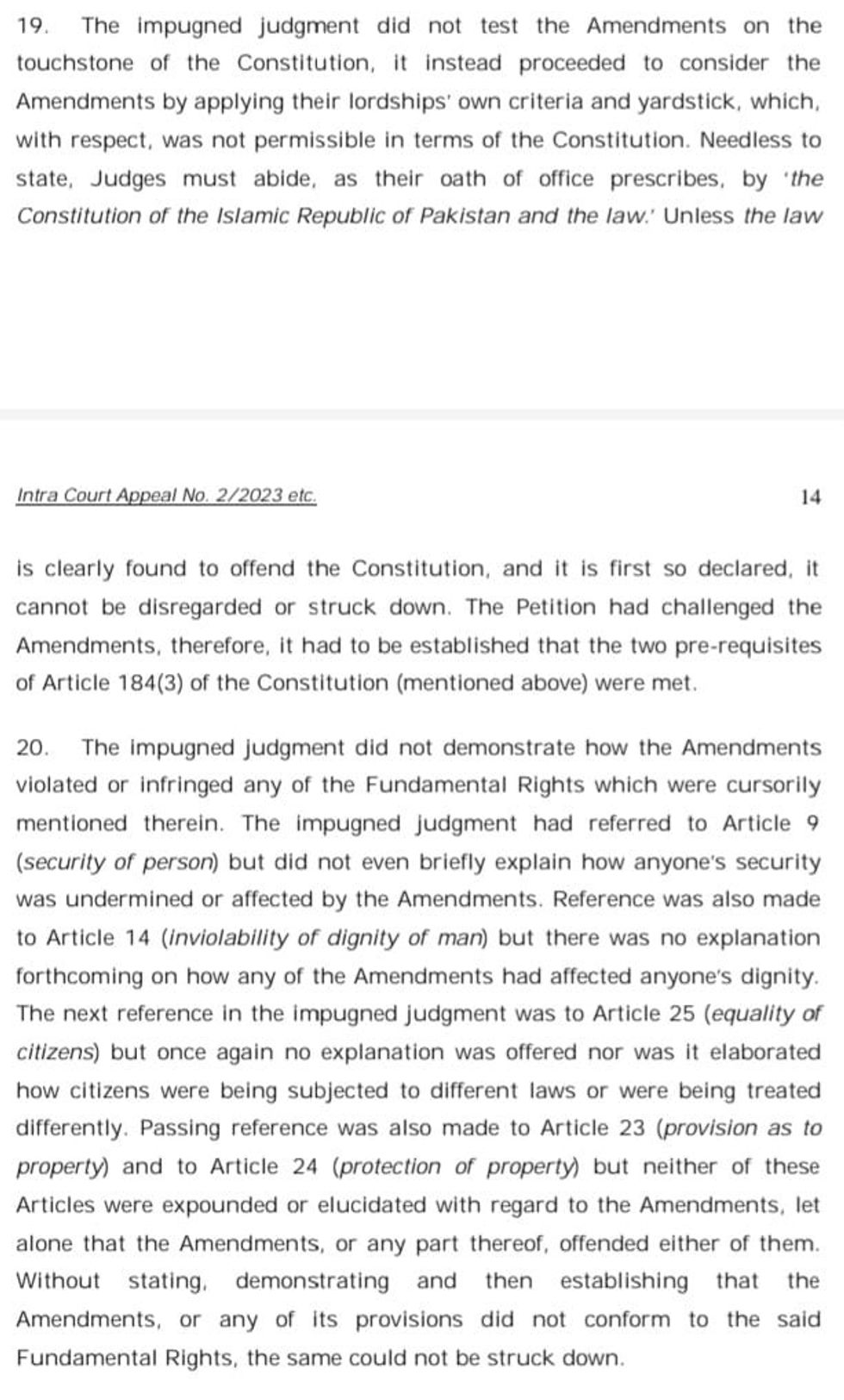 Criticizing the earlier judgment of the former chief justice, CJP Isa noted that, “The impugned judgment did not test the Amendments on the touchstone of the Constitution, it instead proceeded to consider the Amendments by applying their lordships’ own criteria and yardstick, which, with respect, was not permissible in terms of the Constitution”.