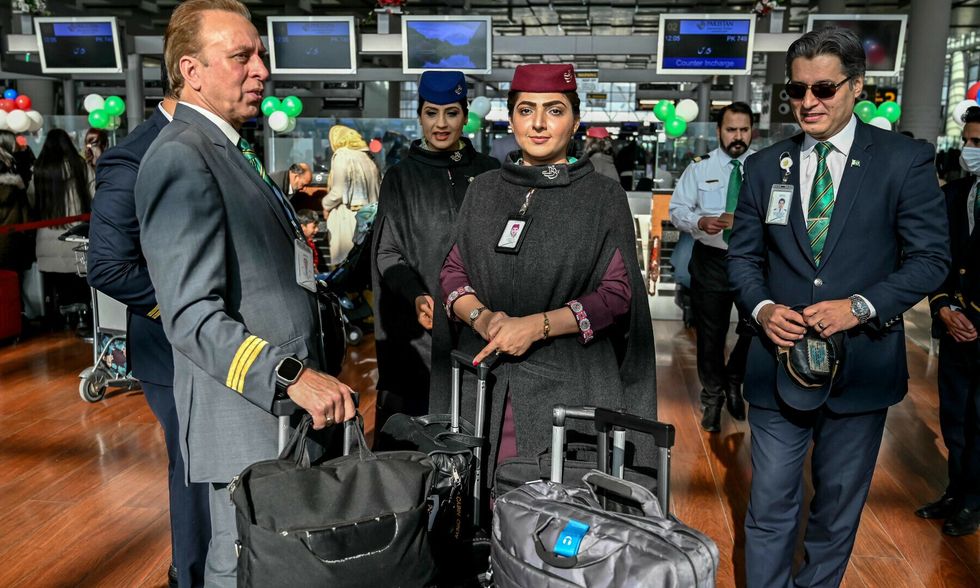 Ground staff stand next to the Pakistan International Airline (PIA) aircraft ahead of its takeoff for Paris at the Islamabad International Airport on Jan 10, 2025.