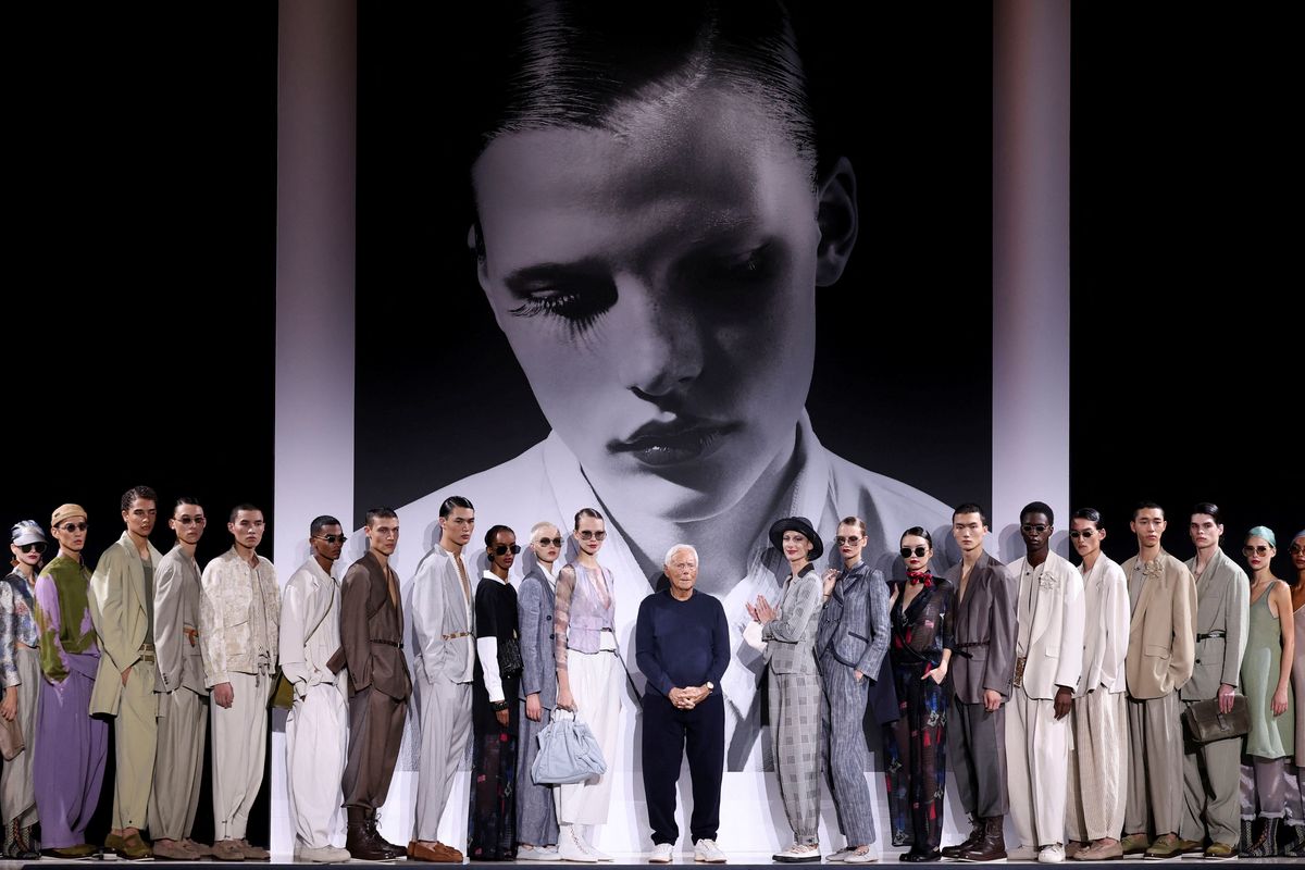 Armani, 90, stuck to beige, grey, sage and pink with bursts of blue and fuchsia. At the end of the show, he greeted the audience with four design collaborators, including his niece Silvana Armani. He will present the latest collection for his main eponymous line in New York next month.