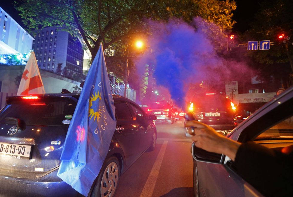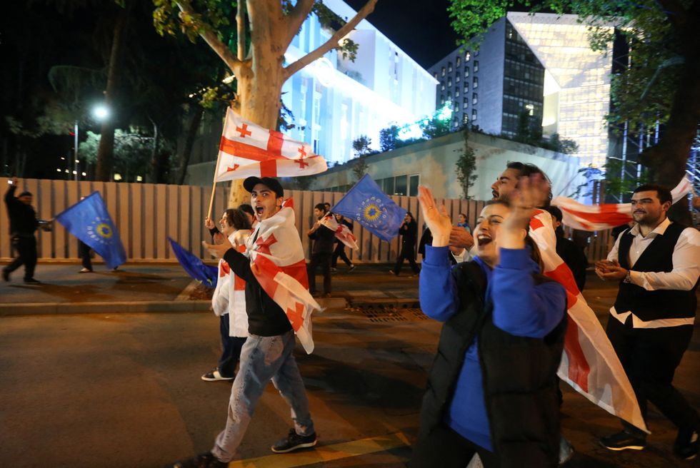 Supporters of the Georgian Dream party celebrate at the party's headquarters after the announcement of exit poll results in parliamentary elections, in Tbilisi, Georgia October 26, 2024.