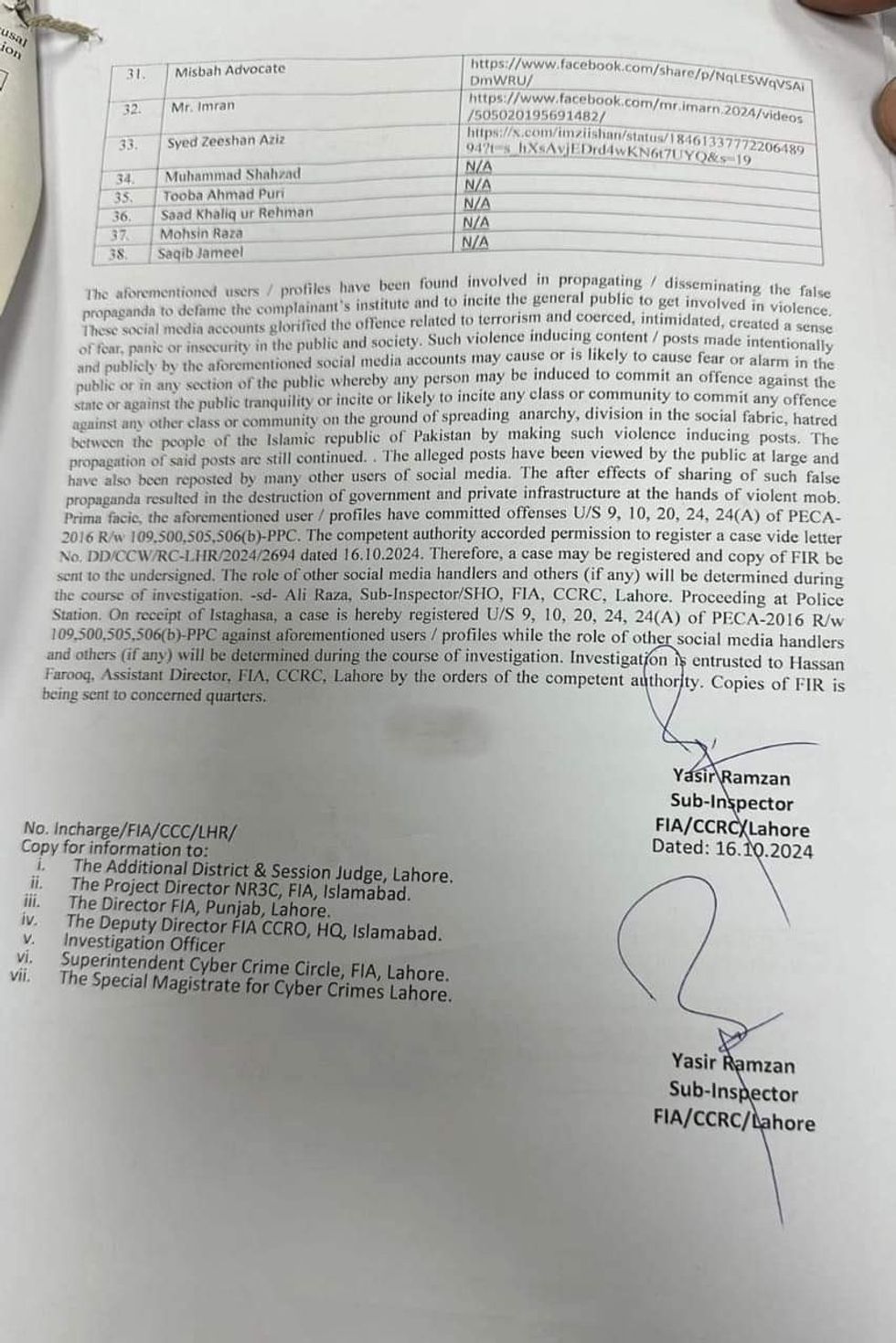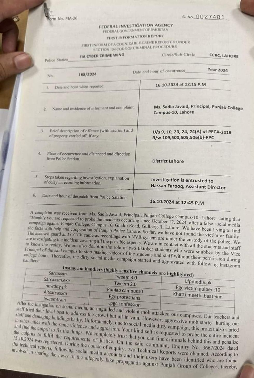 Meanwhile, the Federal Investigation Agency's (FIA) Cyber Crime Wing in Lahore launched an investigation on Thursday into various social media accounts and journalists following a complaint submitted by Sadia Javaid, Principal of Punjab Group of Colleges Campus 10.