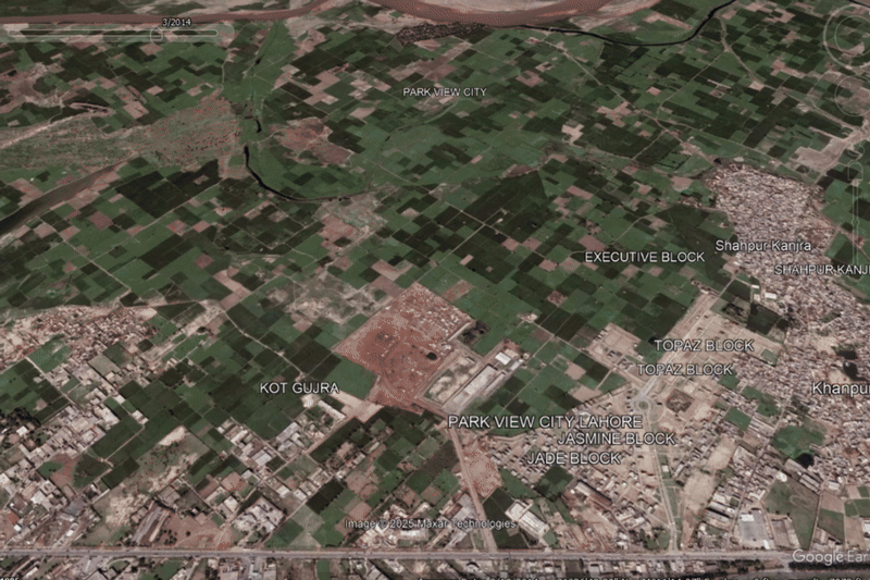 Floodwaters surround homes in Theme Park View Society, Lahore, on August 29, 2025. These developments encroaching on the riverbed helped spread the deluge, protecting Sindh from catastrophic flooding.