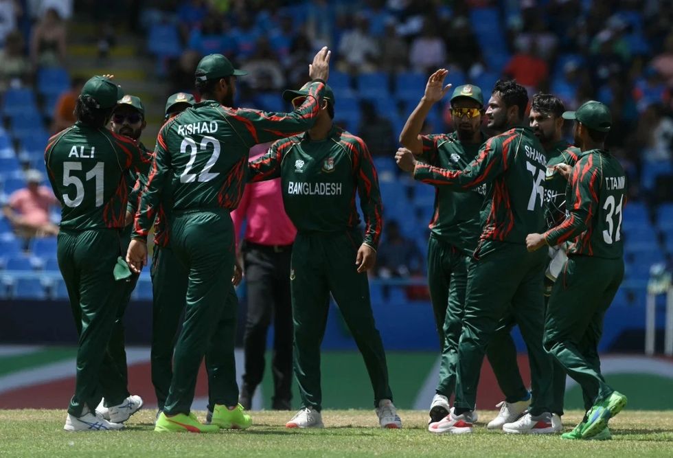Bangladesh's Shakib Al Hasan celebrates with teammates after taking the wicket of England's Rehan Ahmed during the third ODI in Chattogram in 2023.