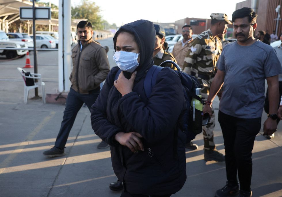 Security personnel escort Indian immigrants deported from the U.S., as they leave the airport in Ahmedabad, India February 6, 2025