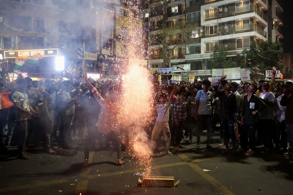 People celebrate after India won the ICC Men's Champions Trophy after defeating New Zealand in the finals, on a street in Mumbai, India, March 9, 2025.