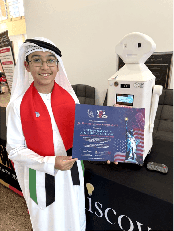 Ali Al Loughani, a young Emirati inventor and member of the UAE Children’s Parliament was awarded the Best Innovation Award in the Robotics and Artificial Intelligence category at the Best Young Inventors Competition held in Dallas, USA.