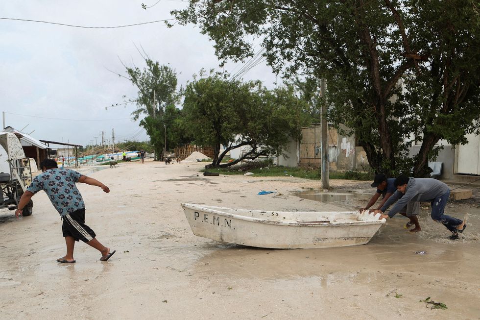 People move a boat after Hurricane Milton brought heavy rain to Mexico's Yucatan Peninsula on its way to Florida, in Celestun, Mexico October 8, 2024.