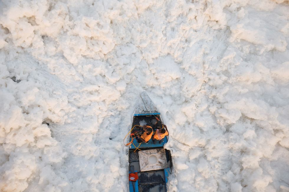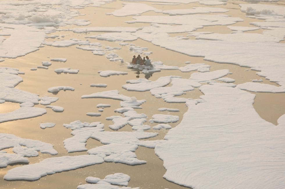 Cows and buffaloes wade into the polluted Yamuna river on a smoggy morning in New Delhi, India, November 5, 2024.
