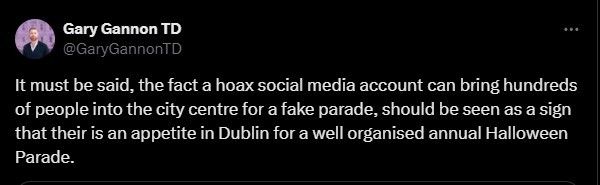 The prank showed at least that "there is appetite in Dublin for a well-organised Halloween parade," said local politician Gary Gannon on X.