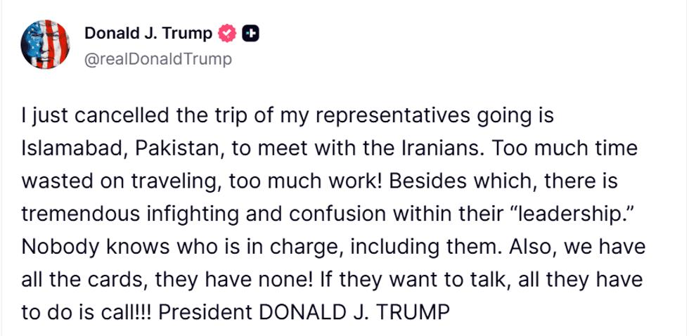 In a post on Truth Social, Trump said he had cancelled the trip, calling it a “waste of time” and citing what he described as “infighting and confusion” within Iran’s leadership. “If they want to talk, all they have to do is call,” he wrote.